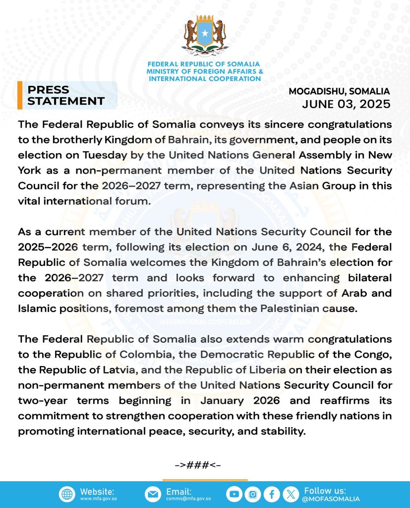 As a current member of the United Nations Security Council for the 2025–2026 term, following its election on June 6, 2024, the Federal Republic of Somalia welcomes the Kingdom of Bahrain’s election for the 2026–2027 term and looks forward to enhancing bilateral cooperation on shared priorities, including the support of Arab and Islamic positions, foremost among them the Palestinian cause.